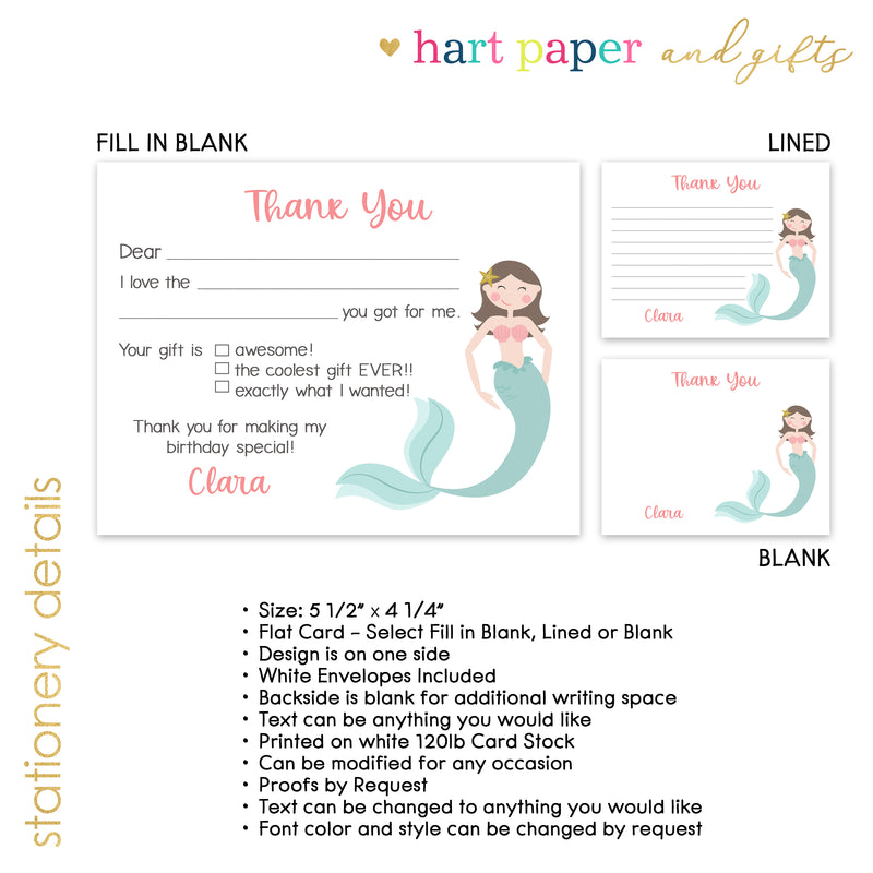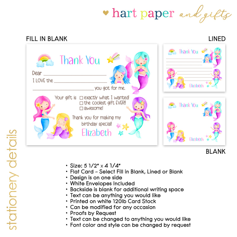 Mermaid Thank You Note Card Personalized Custom Stationery • Fill in Blank, Lined or Blank Cards