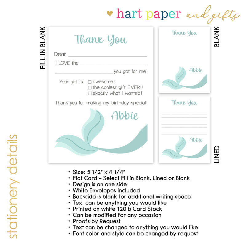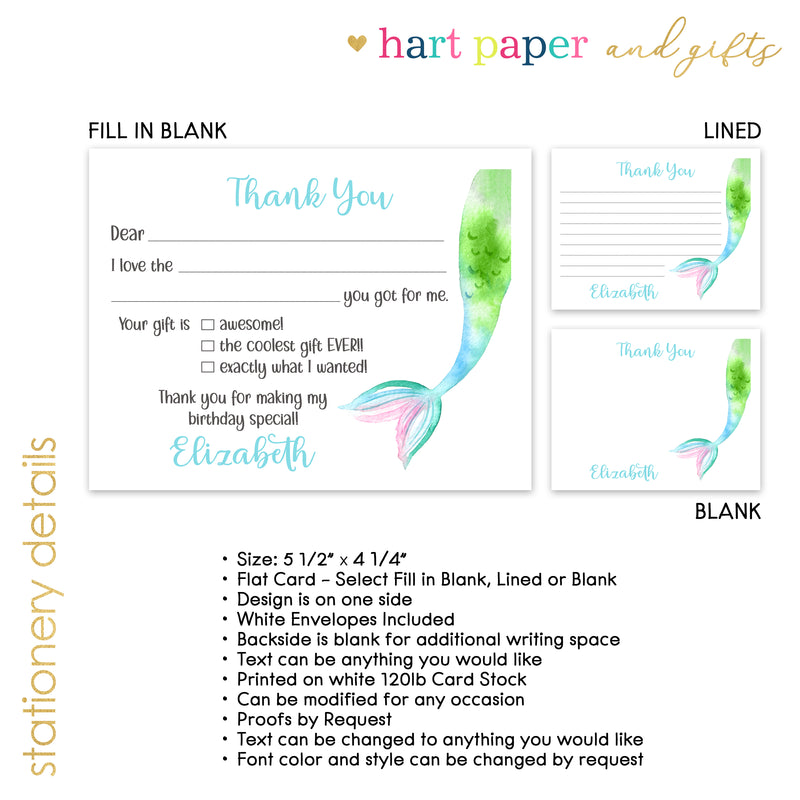 Mermaid Tail Thank You Note Card Personalized Custom Stationery • Fill in Blank, Lined or Blank Cards