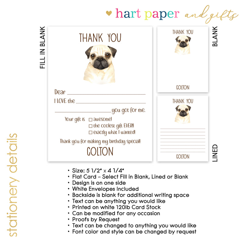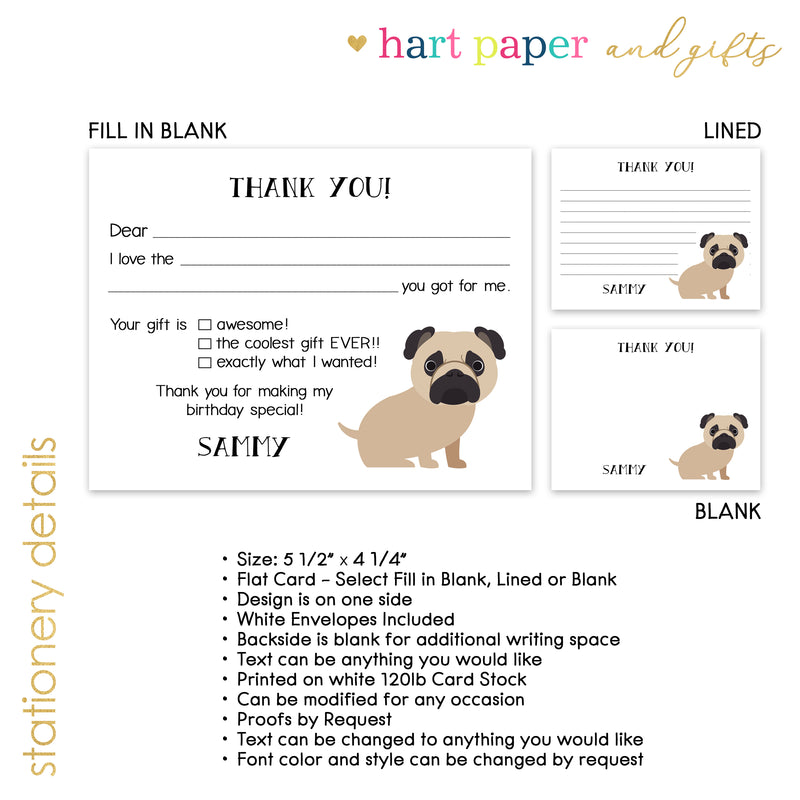 Pug Dog Thank You Note Card Personalized Custom Stationery • Fill in Blank, Lined or Blank Cards