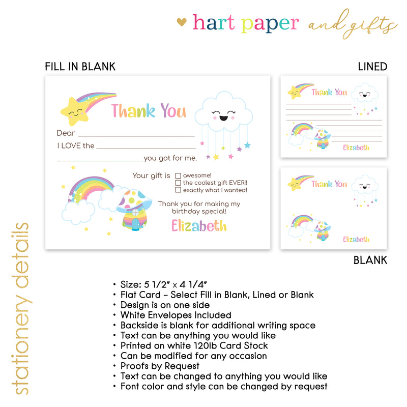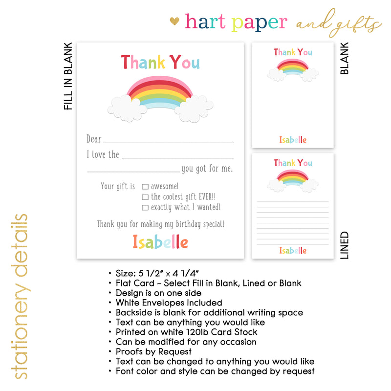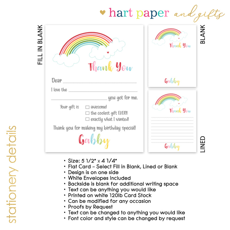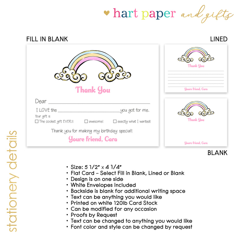 Rainbow Thank You Note Card Personalized Custom Stationery • Fill in Blank, Lined or Blank Cards