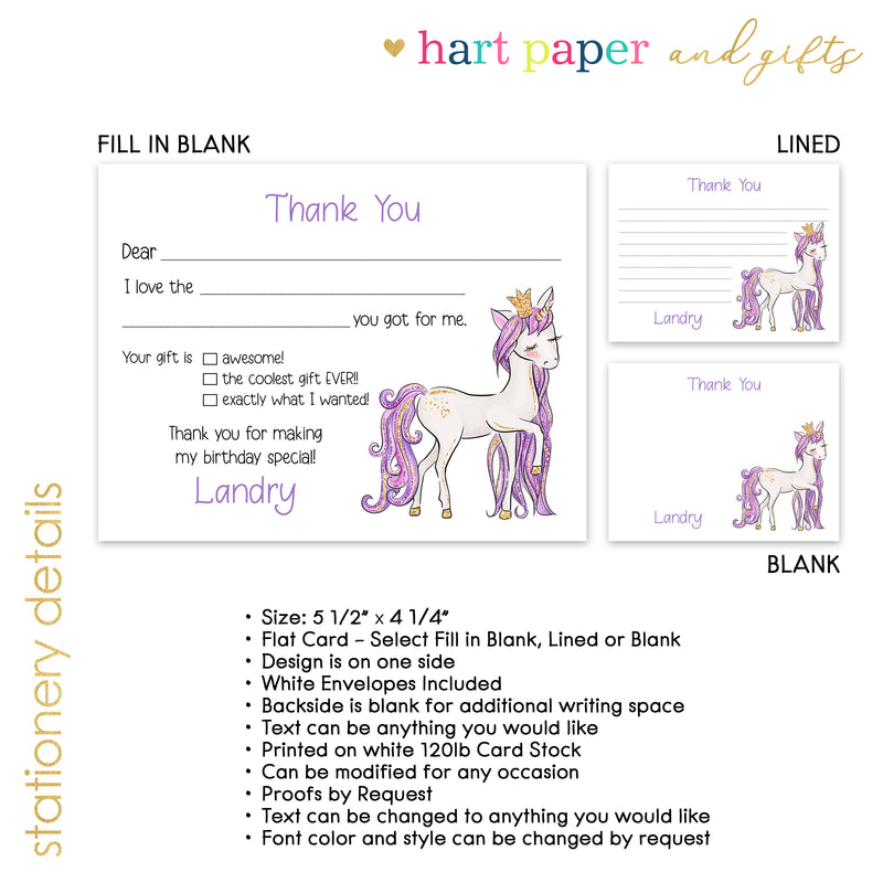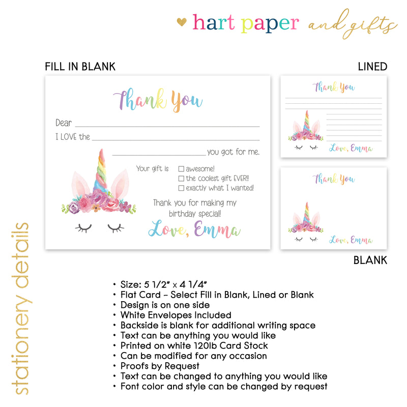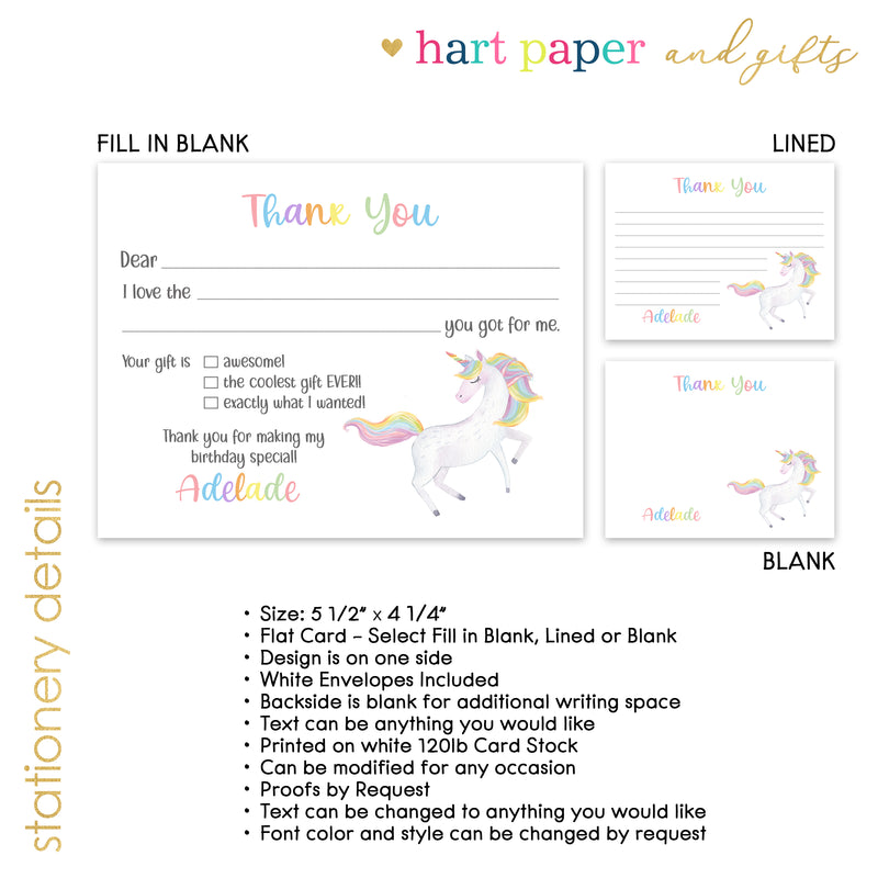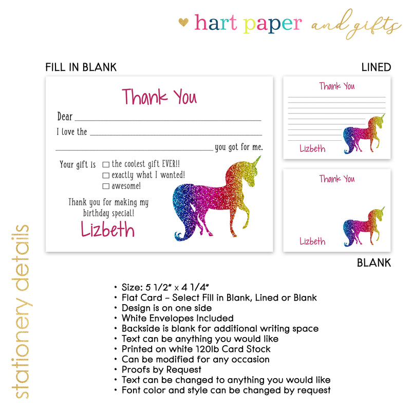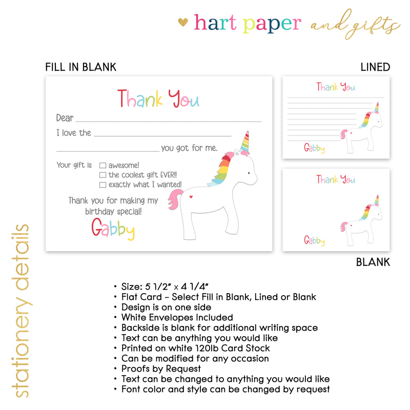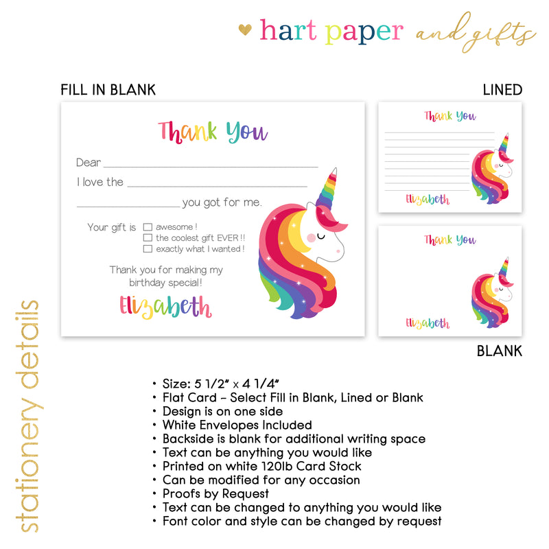 Rainbow Unicorn Thank You Note Card Personalized Custom Stationery • Fill in Blank, Lined or Blank Cards