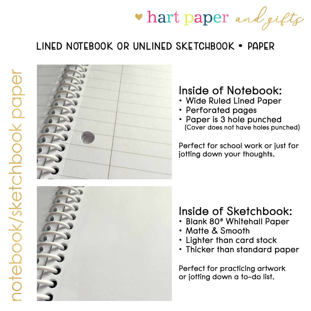 Our personalized notebooks and sketchbooks are ideal for capturing thoughts, doodles, and ideas—whether at school, home, or on the go. Choose from wide-ruled lined notebooks for writing or blank sketchbooks for drawing, sketching, or journaling.