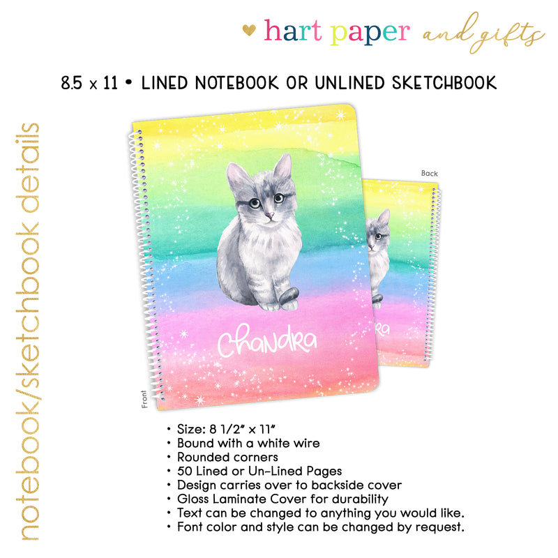 Rainbow Cat Personalized Custom Notebook or Sketchbook • School Office Supplies