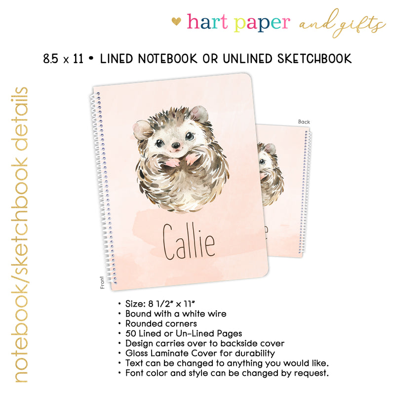 Hedgehog Personalized Custom Notebook or Sketchbook • School Office Supplies