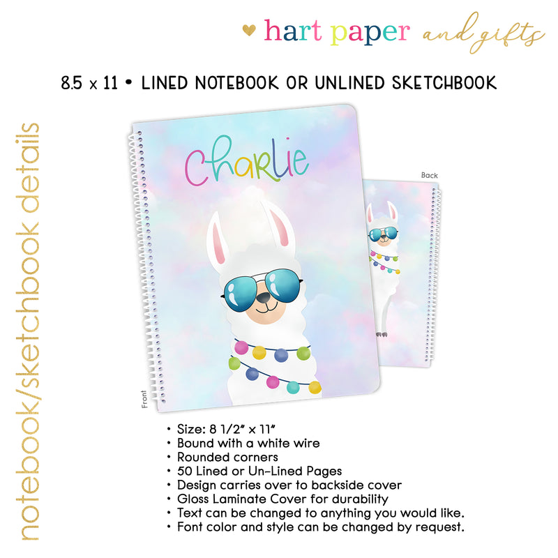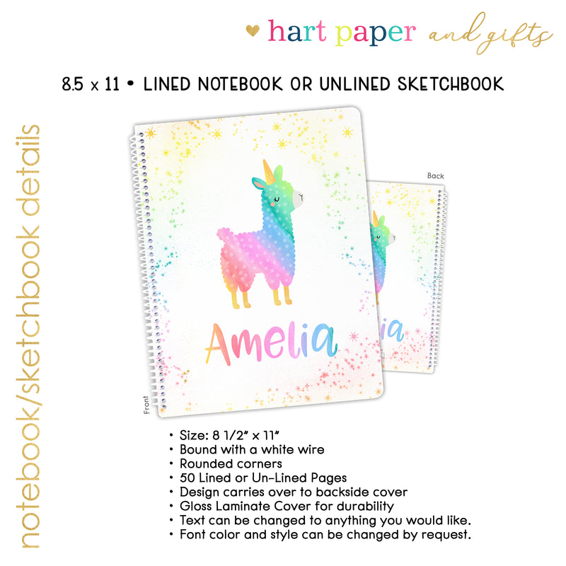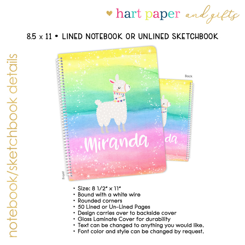 Rainbow Llama Personalized Custom Notebook or Sketchbook • School Office Supplies