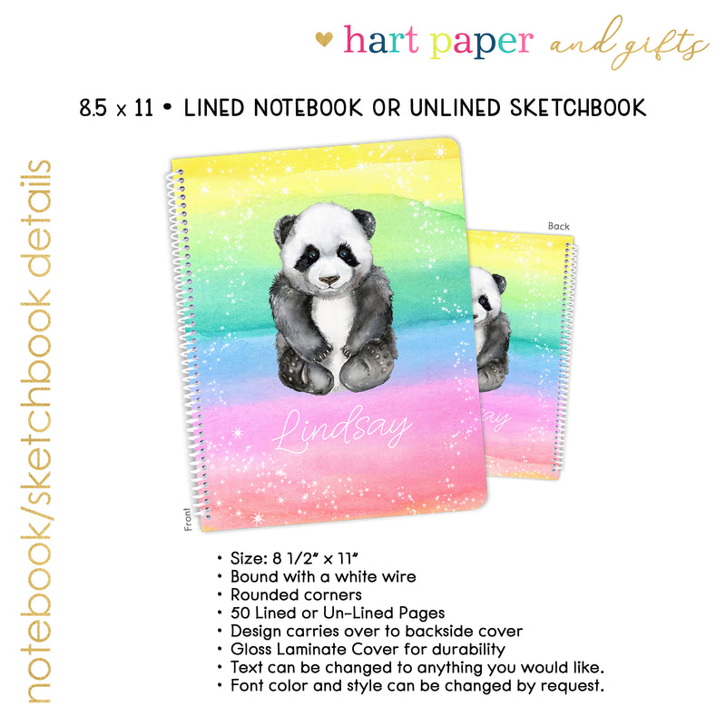 Rainbow Panda Bear Personalized Custom Notebook or Sketchbook • School Office Supplies