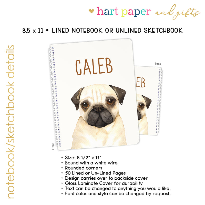 Pug Personalized Custom Notebook or Sketchbook • School Office Supplies