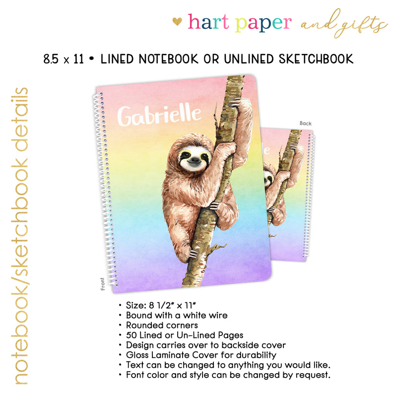 Rainbow Sloth Personalized Custom Notebook or Sketchbook • School Office Supplies