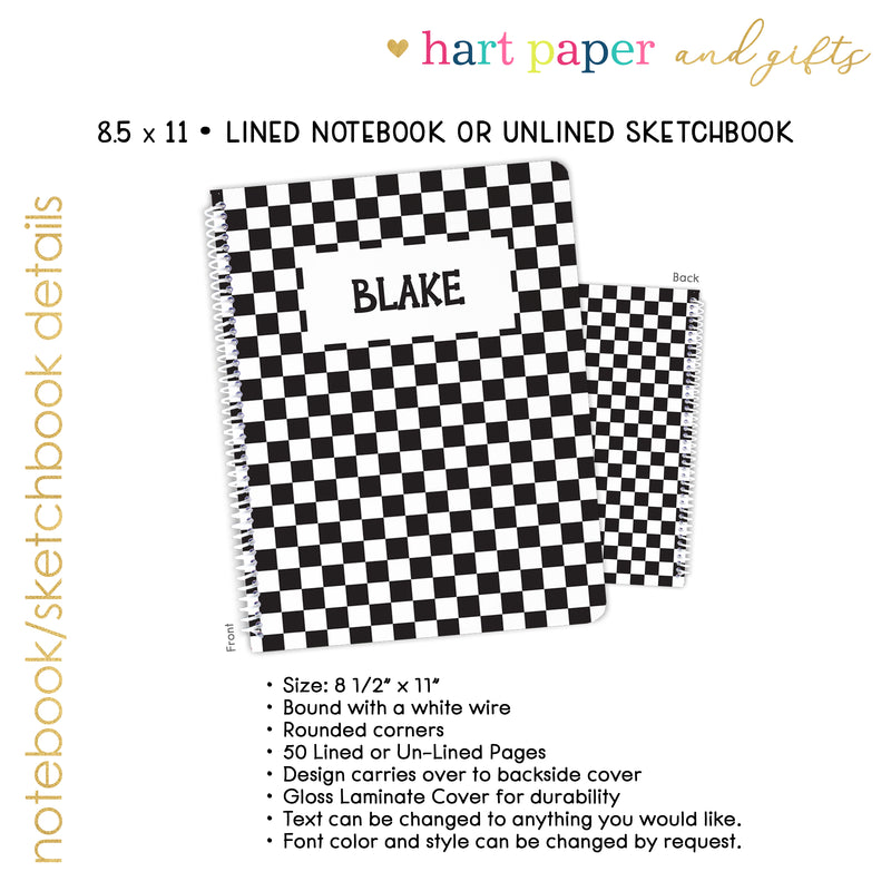 Black White Checks Personalized Custom Notebook or Sketchbook • School Office Supplies
