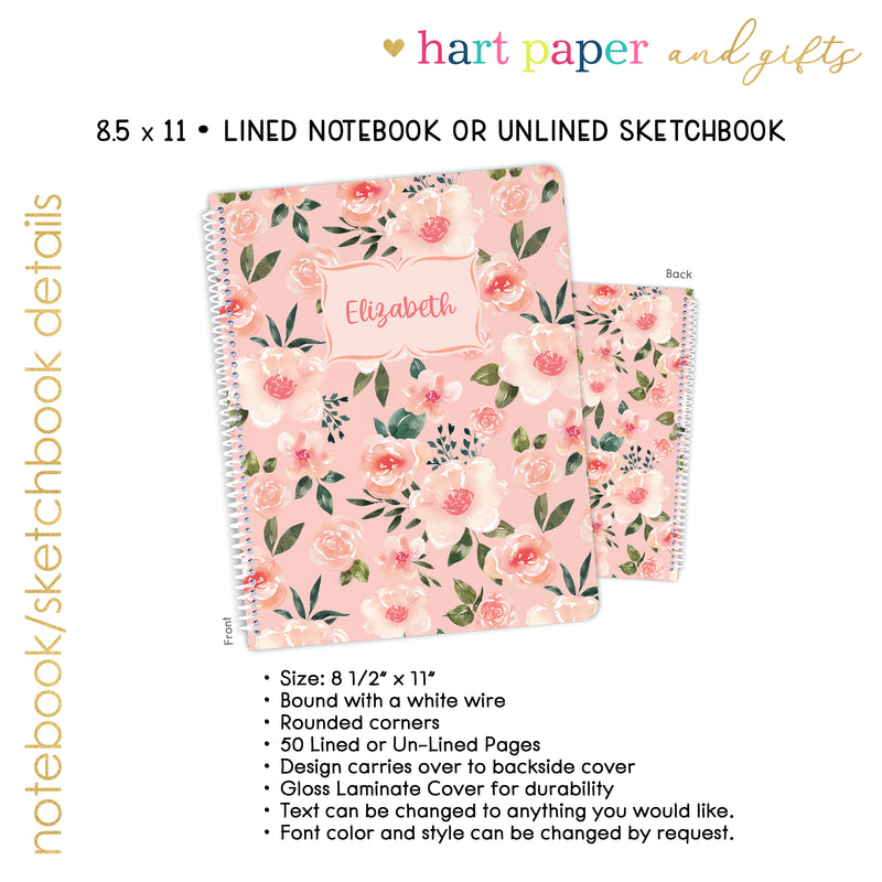 Pink Rose Flowers Personalized Custom Notebook or Sketchbook • School Office Supplies