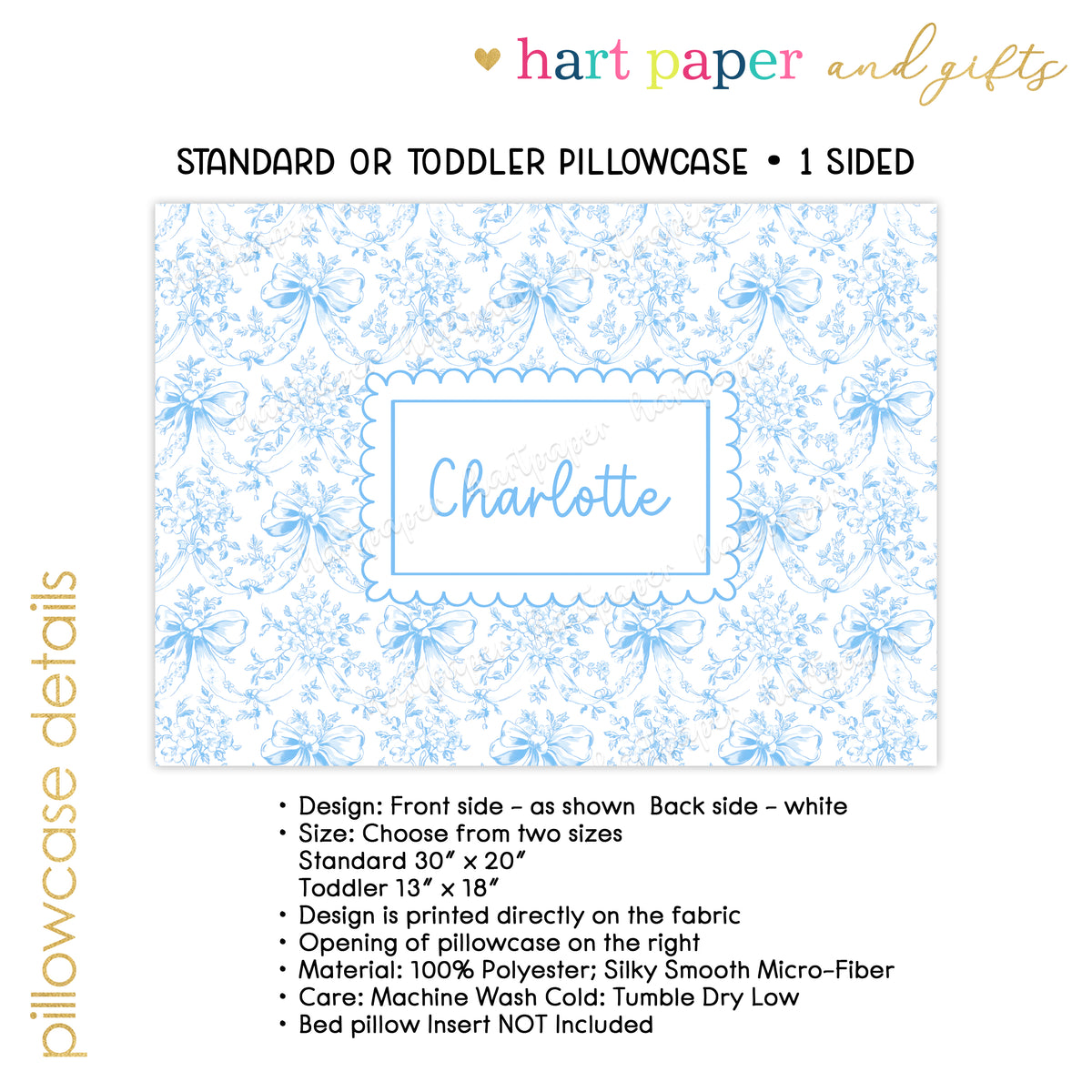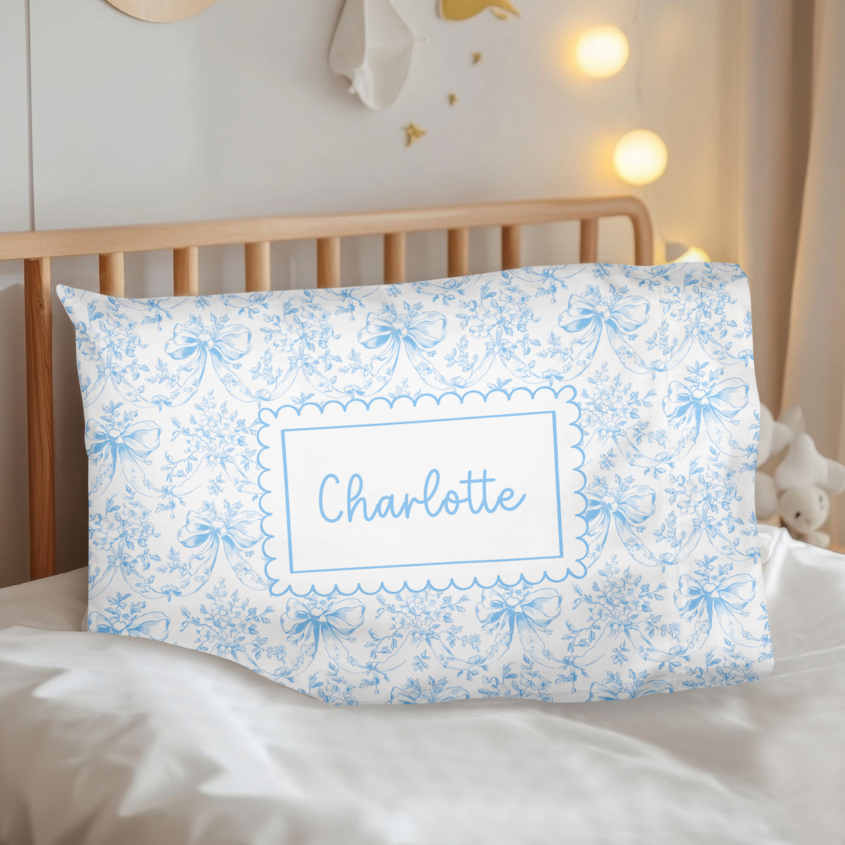 Blue Toile Coquette Bow Chinoiserie Flowers Personalized Custom Pillowcase • Standard or Toddler Size