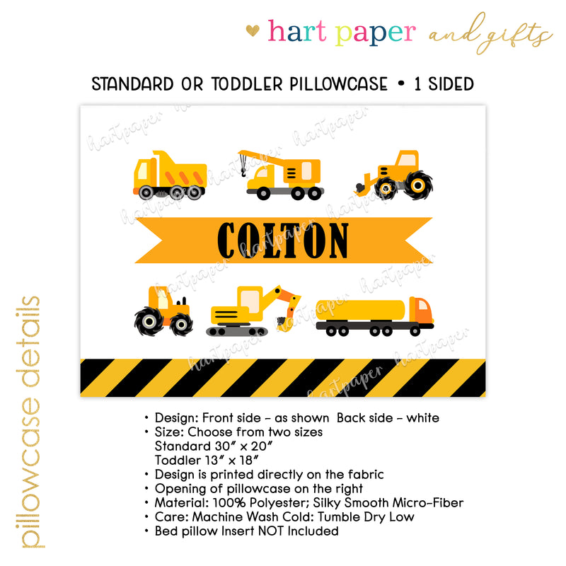 Construction Trucks Personalized Custom Pillowcase • Standard or Toddler Size