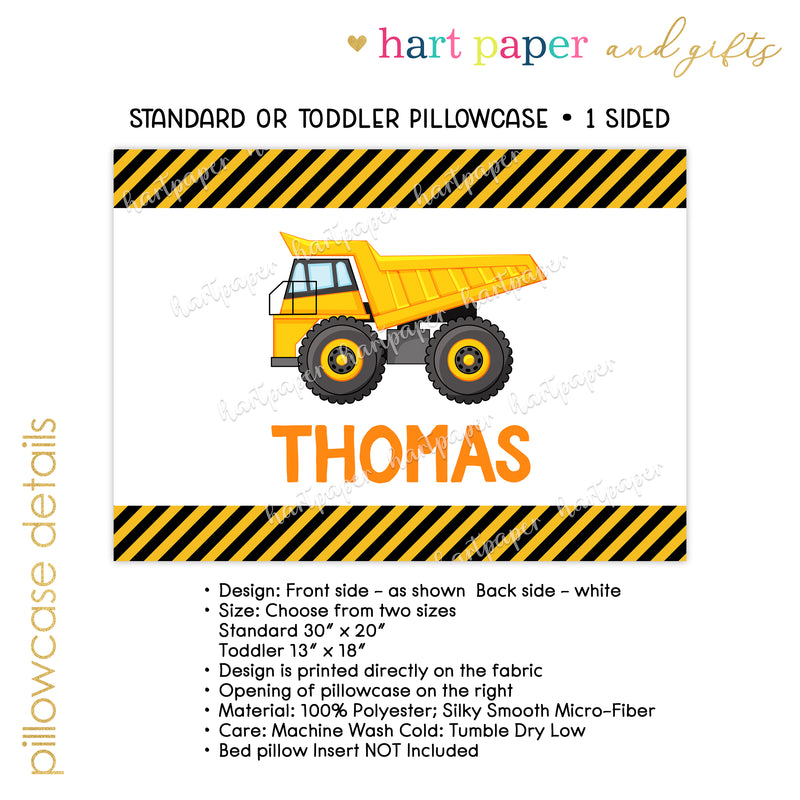 Dump Truck Personalized Custom Pillowcase • Standard or Toddler Size