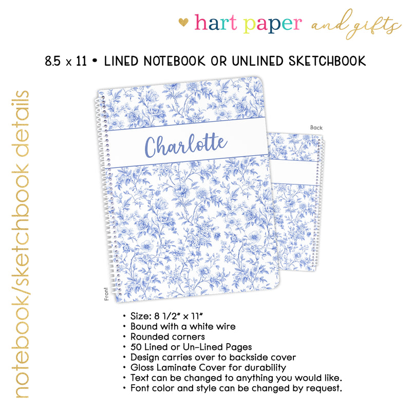Blue Toile Coquette Bow Chinoiserie Flowers Personalized Custom Notebook or Sketchbook • School Office Supplies