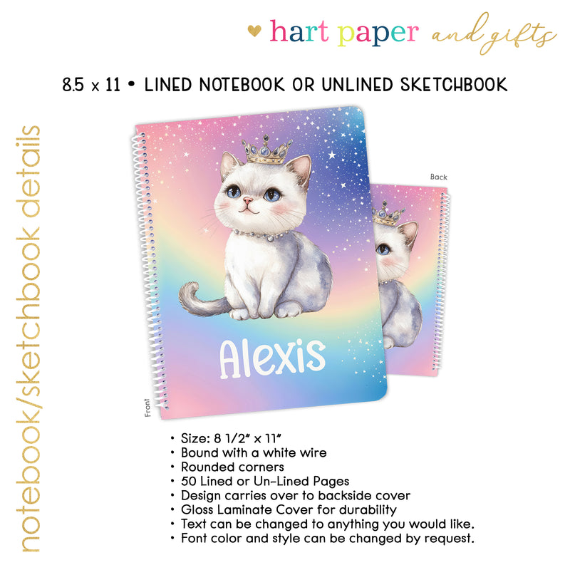 Rainbow Cat Kitten Crown Personalized Custom Notebook or Sketchbook • School Office Supplies