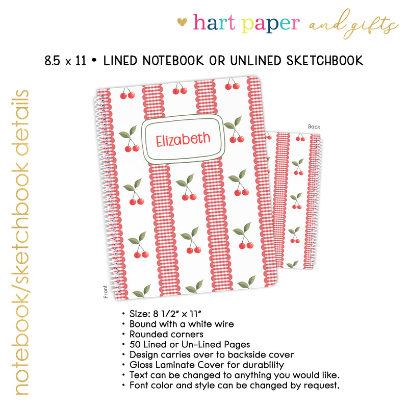 Cherry Cherries Gingham Personalized Custom Notebook or Sketchbook • School Office Supplies