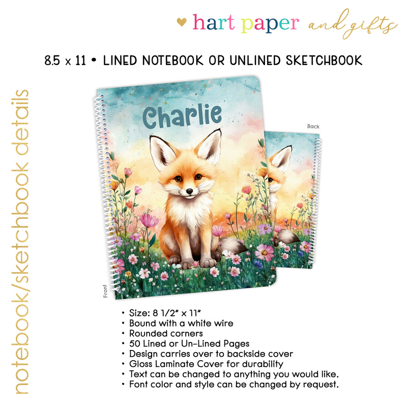 Fox Personalized Custom Notebook or Sketchbook • School Office Supplies