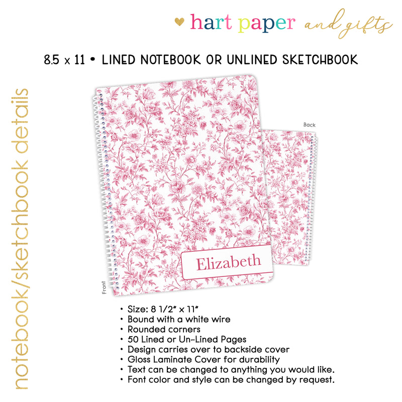 Pink Toile Coquette Bow Chinoiserie Flowers Personalized Custom Notebook or Sketchbook • School Office Supplies
