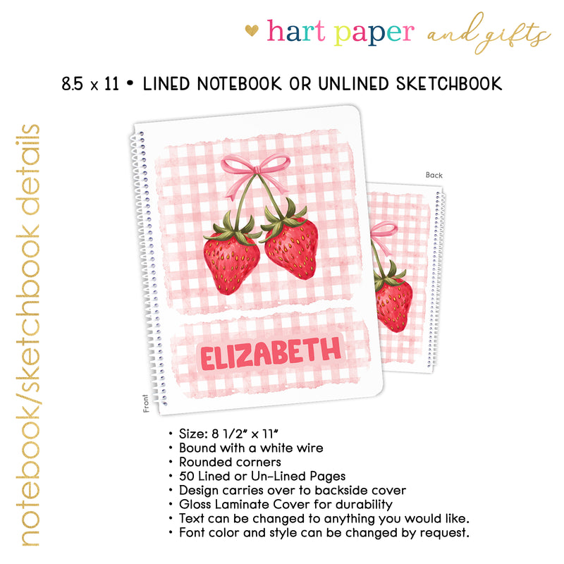 Strawberry Gingham Personalized Custom Notebook or Sketchbook • School Office Supplies