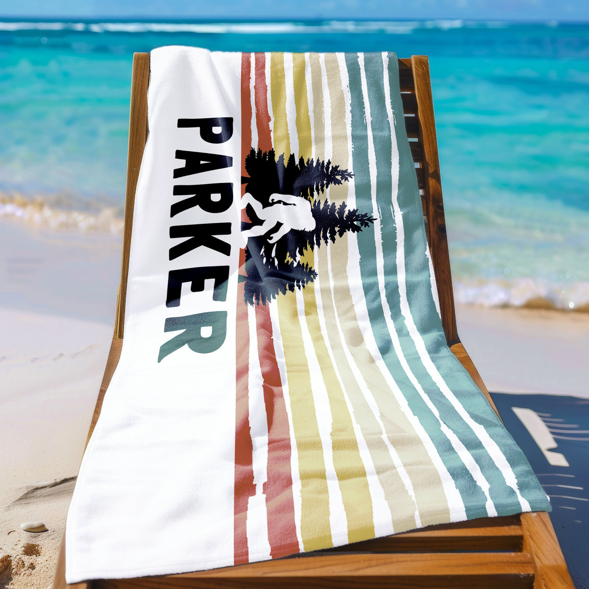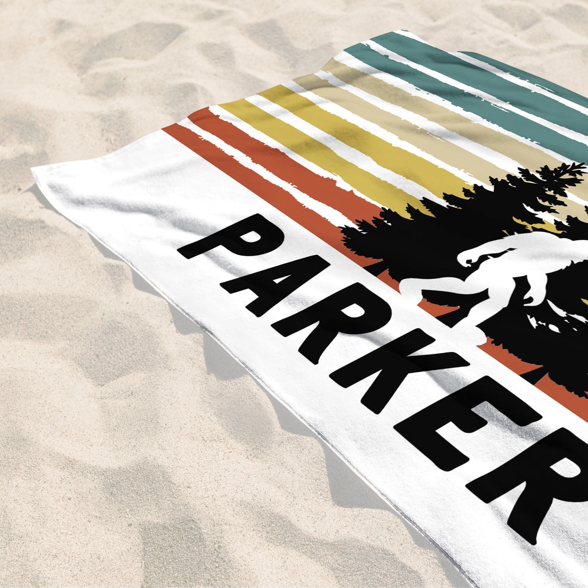 Bigfoot Camping Camp Personalized Beach Towel • Custom 30x60 Swimming Swim Bath Bathroom Pool