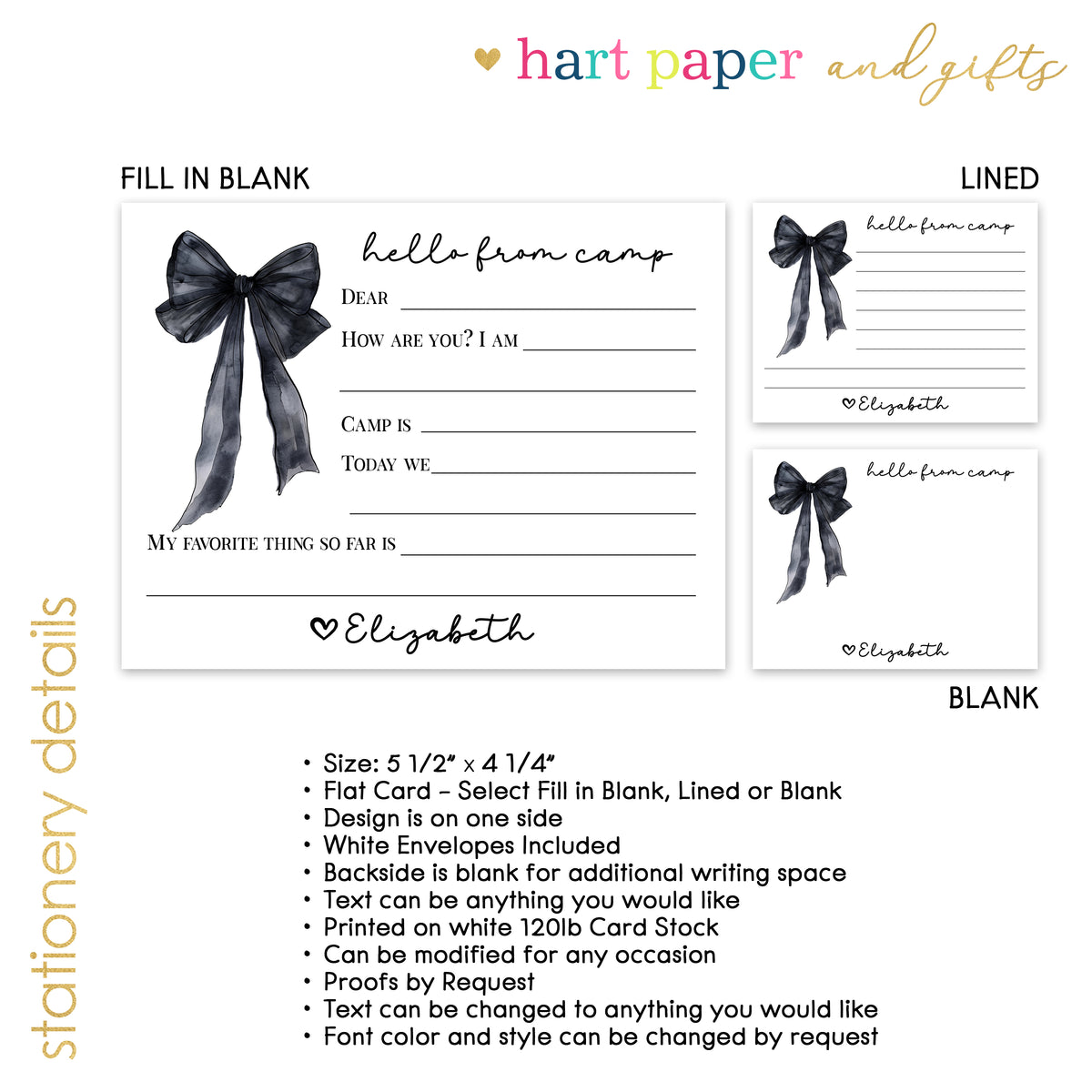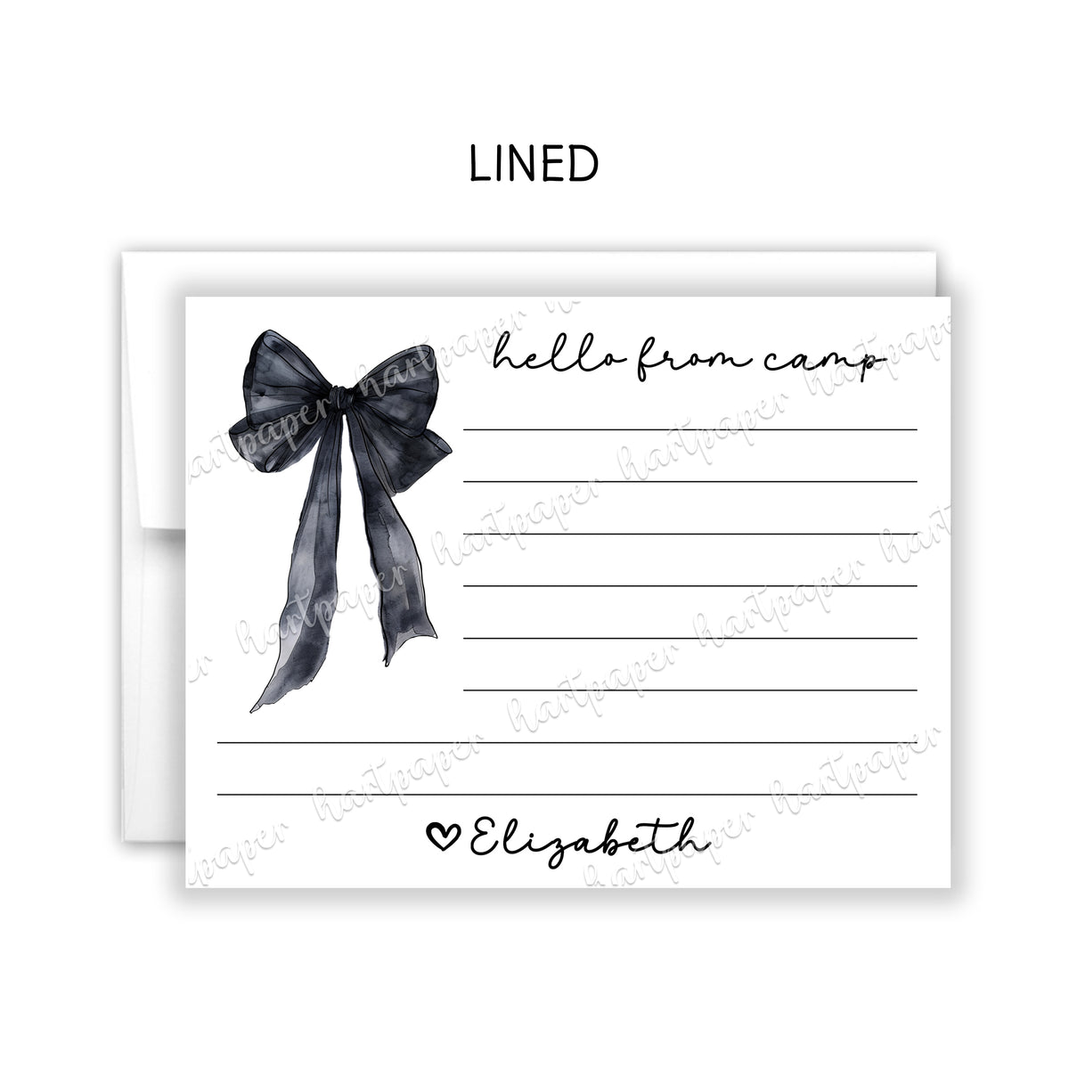 Black Bow Coquette Summer Camp Camping Note Cards Stationery Custom Personalized • Fill in Blank, Lined or Blank Cards
