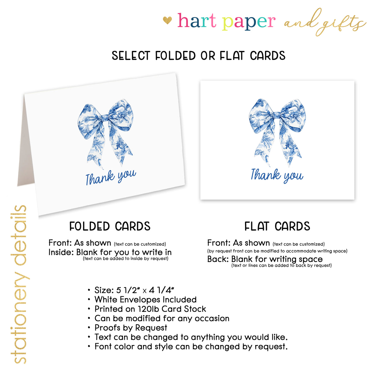 Blue Chinoiserie Coquette Bow Thank You Cards Note Card Personalized Custom Stationery • Flat or Folded
