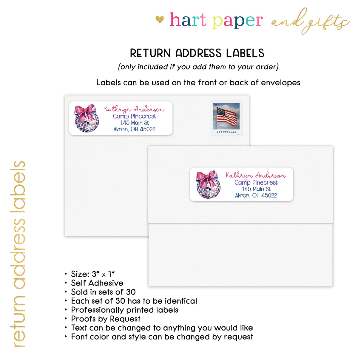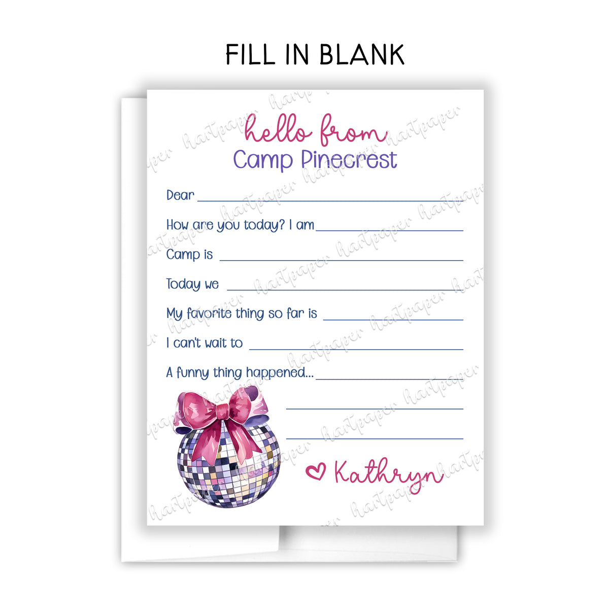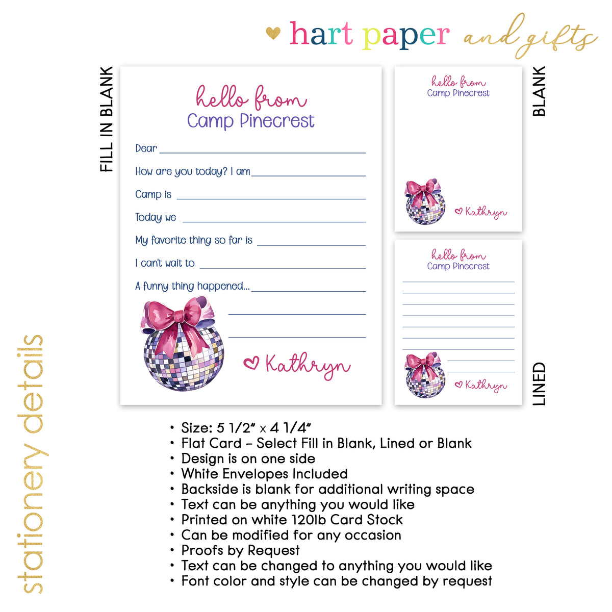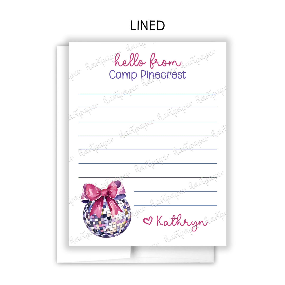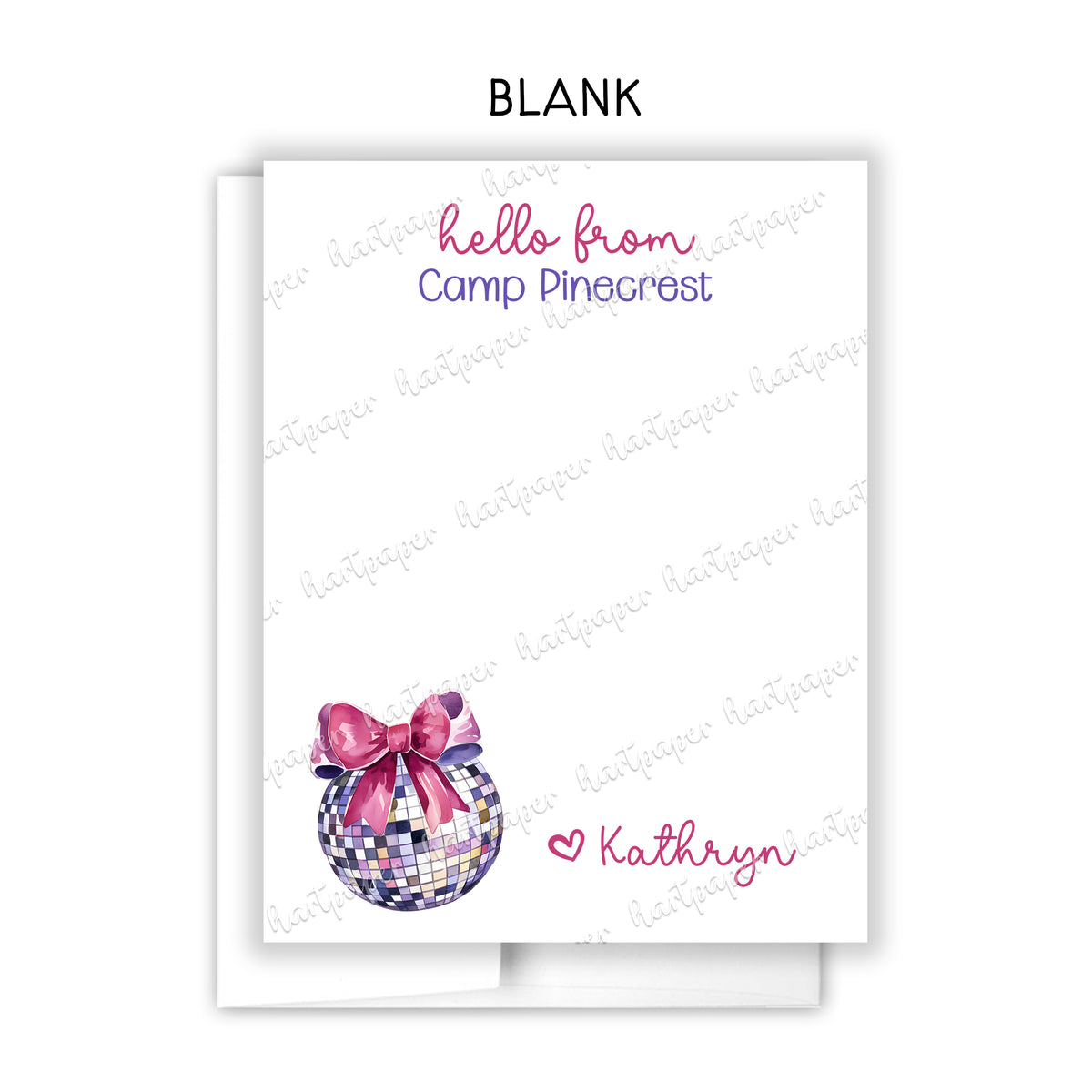 Disco Ball Bow Hello from Camp Summer Camping Note Cards Stationery Custom Personalized • Fill in Blank, Lined or Blank Cards