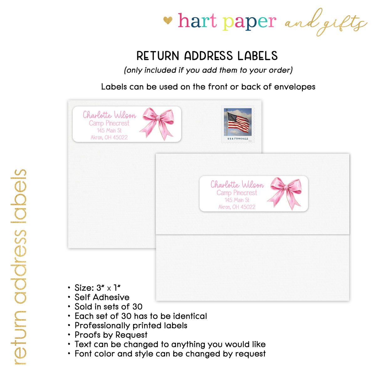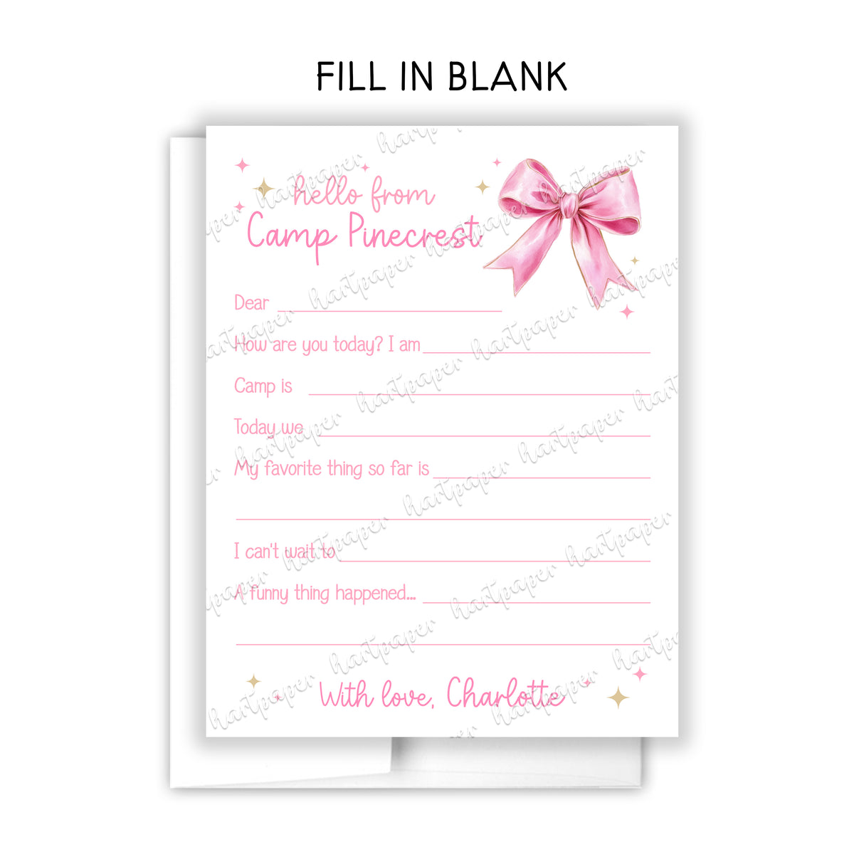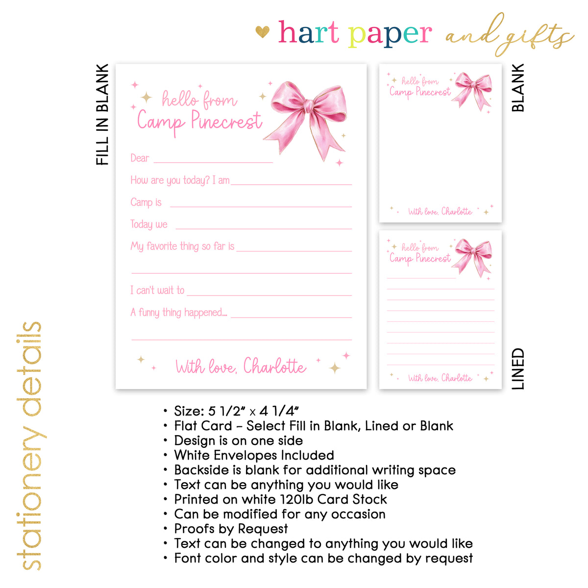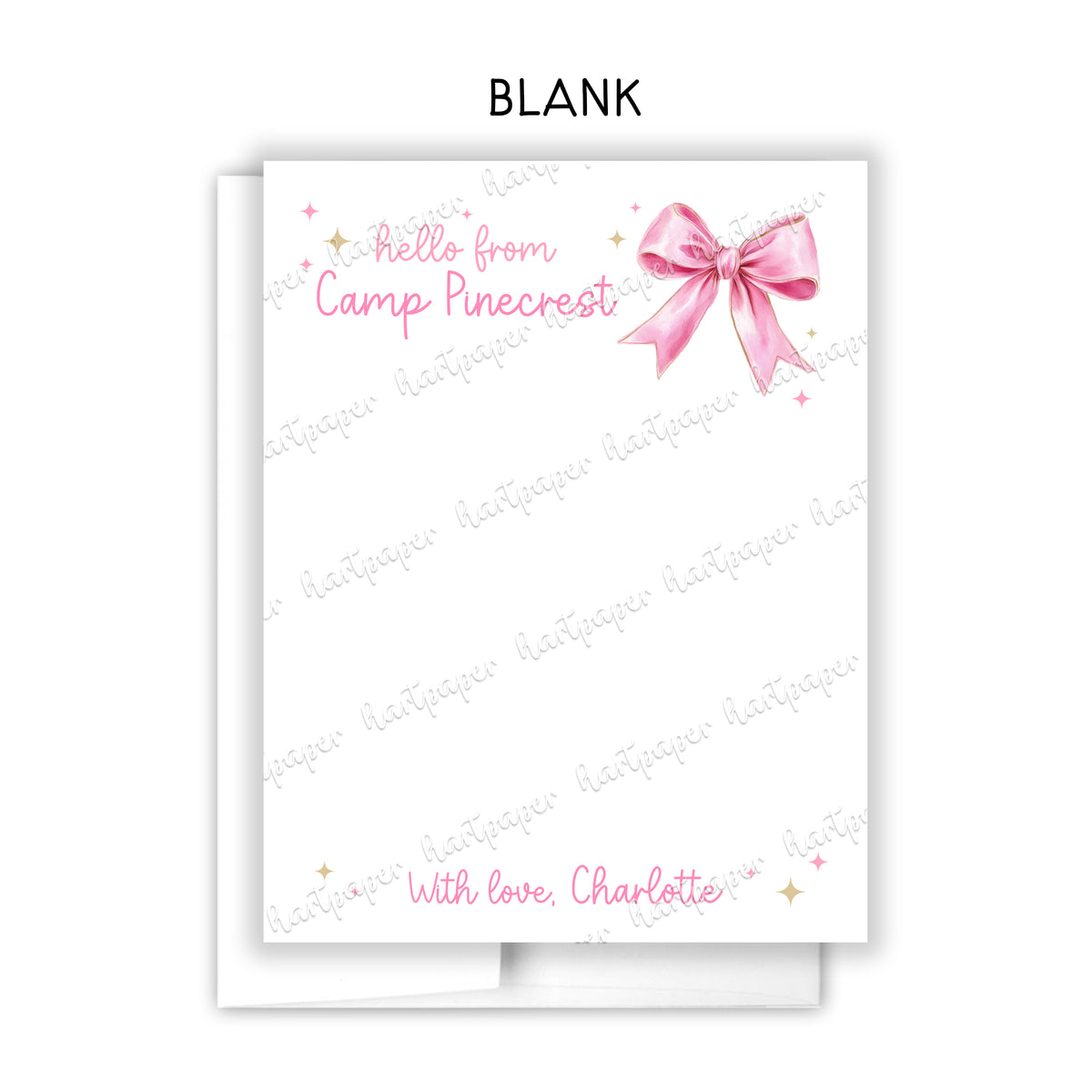 Pink Bow Coquette Summer Camp Camping Note Cards Stationery Custom Personalized • Fill in Blank, Lined or Blank Cards