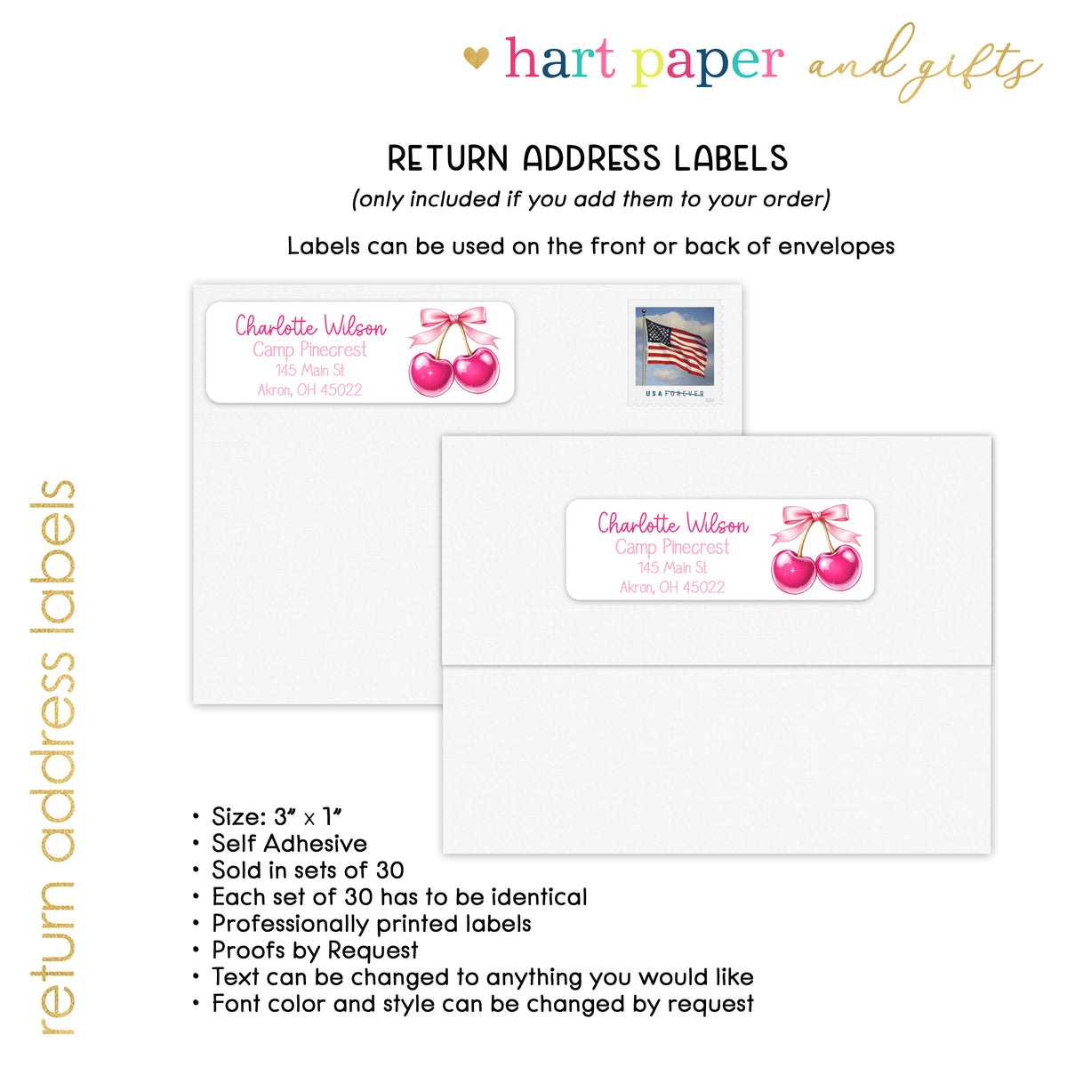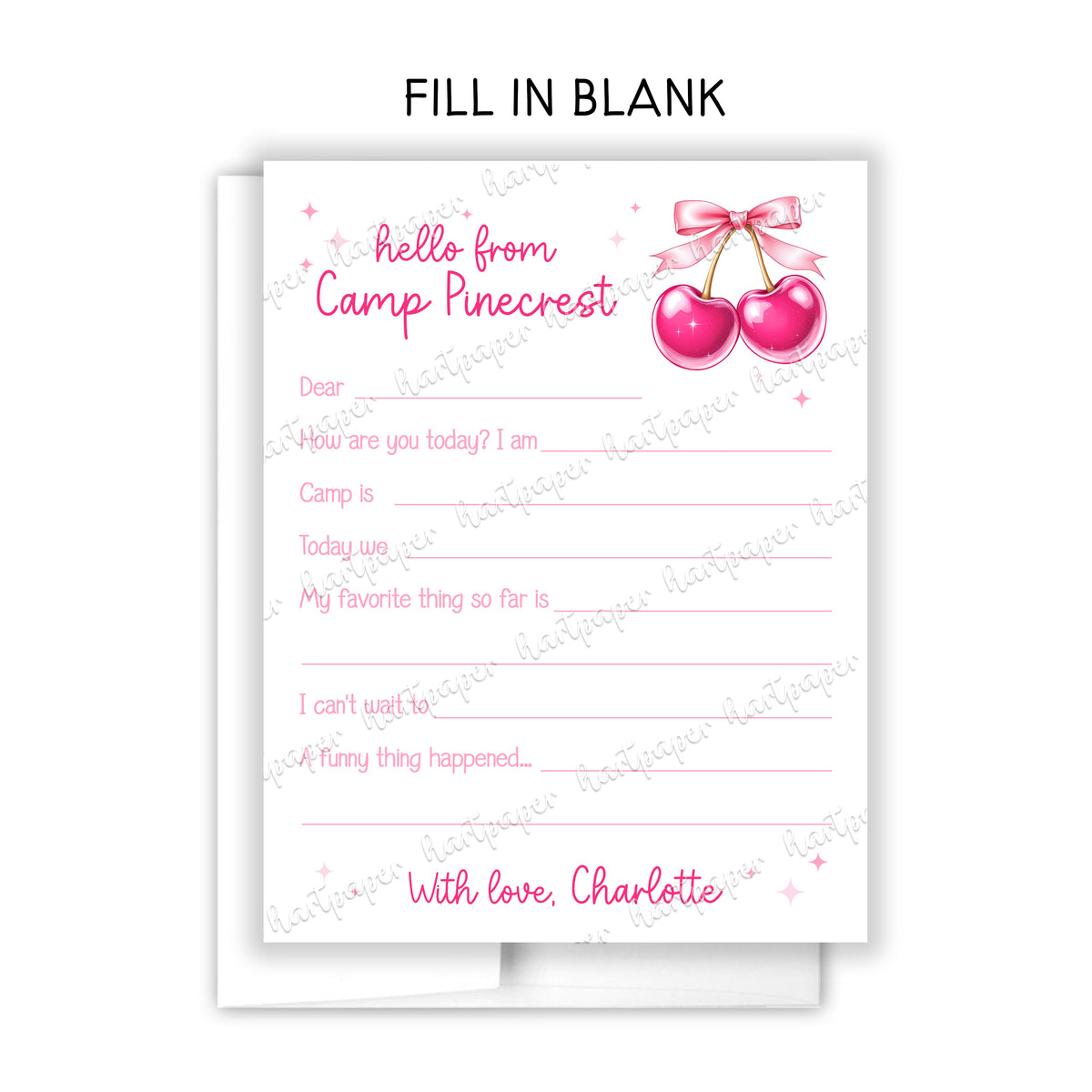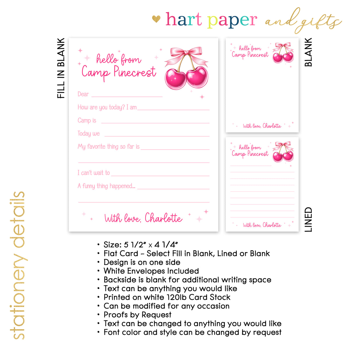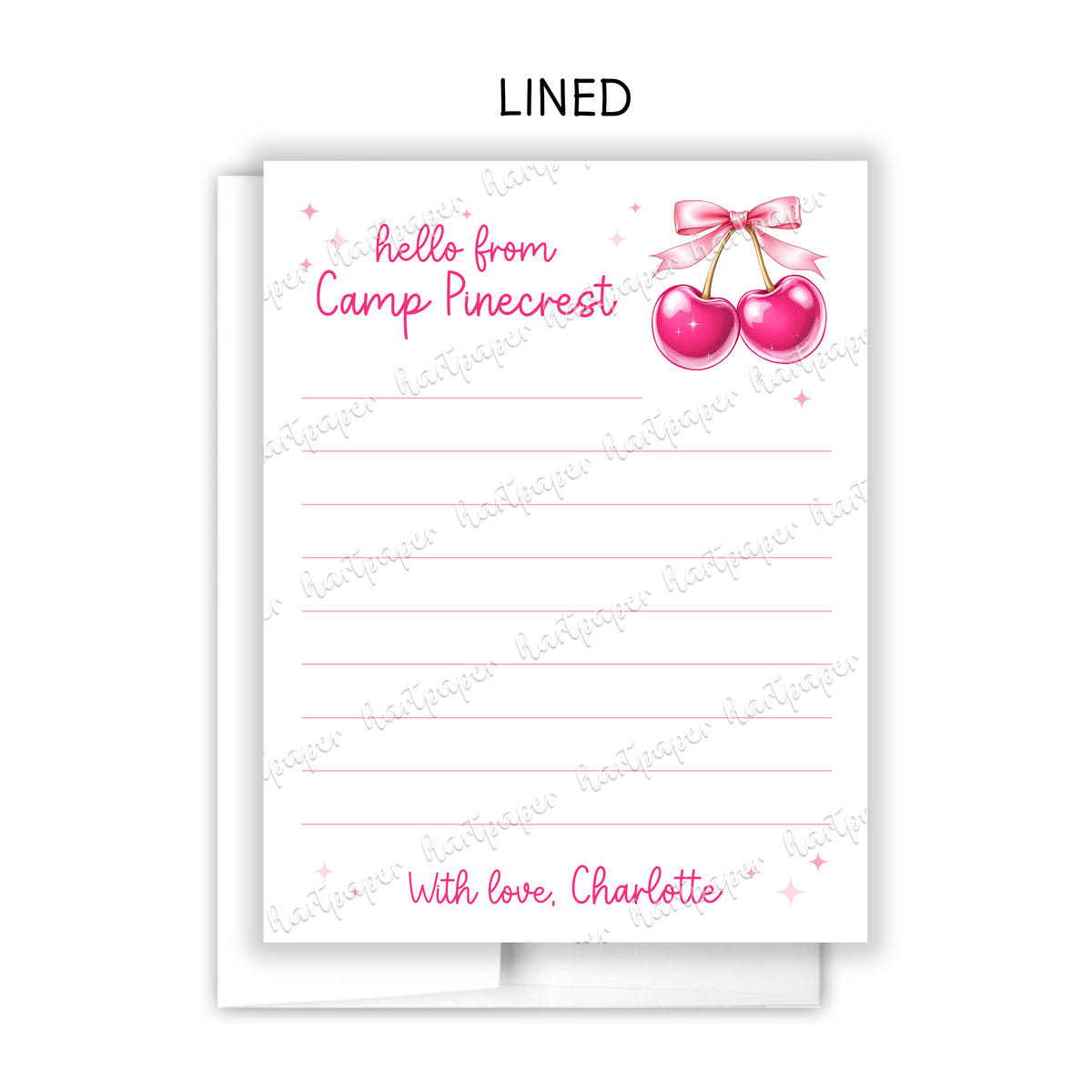 Pink Cherry Bow Coquette Summer Camp Camping Note Cards Stationery Custom Personalized • Fill in Blank, Lined or Blank Cards