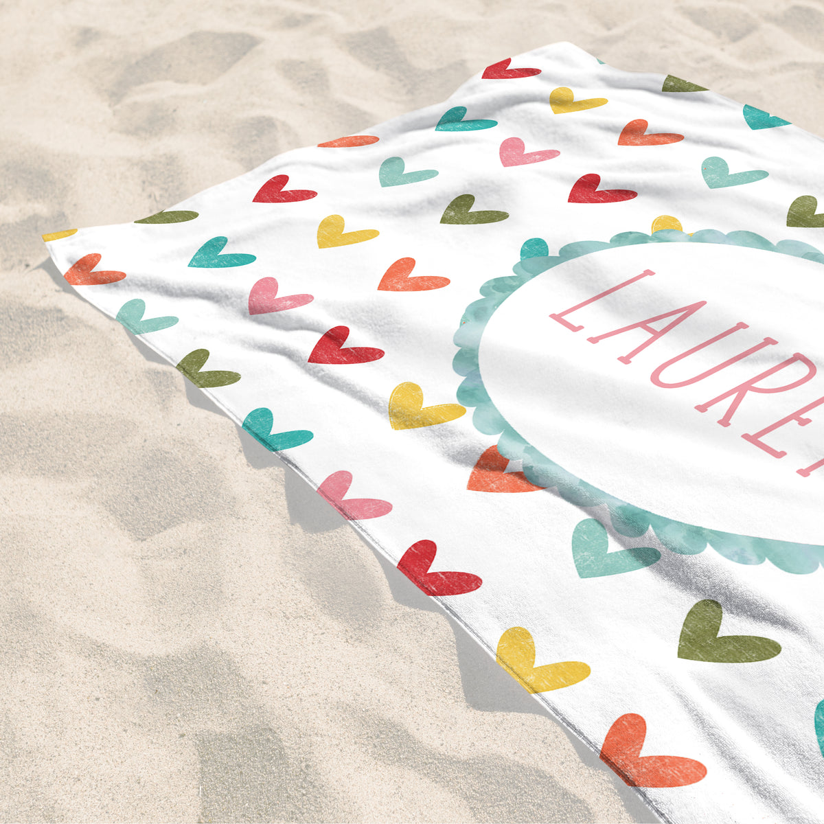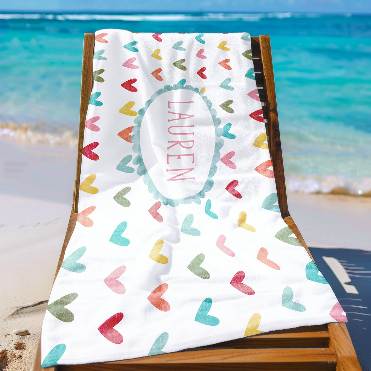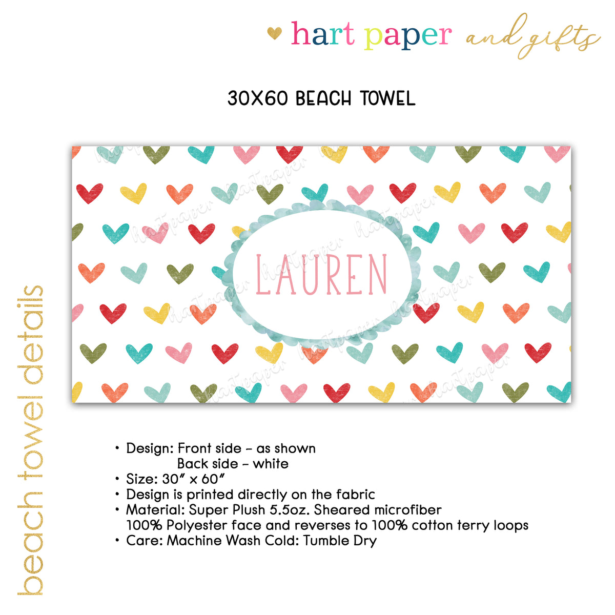 Rainbow Hearts Personalized Beach Towel • Custom 30x60 Swimming Swim Bath Bathroom Pool