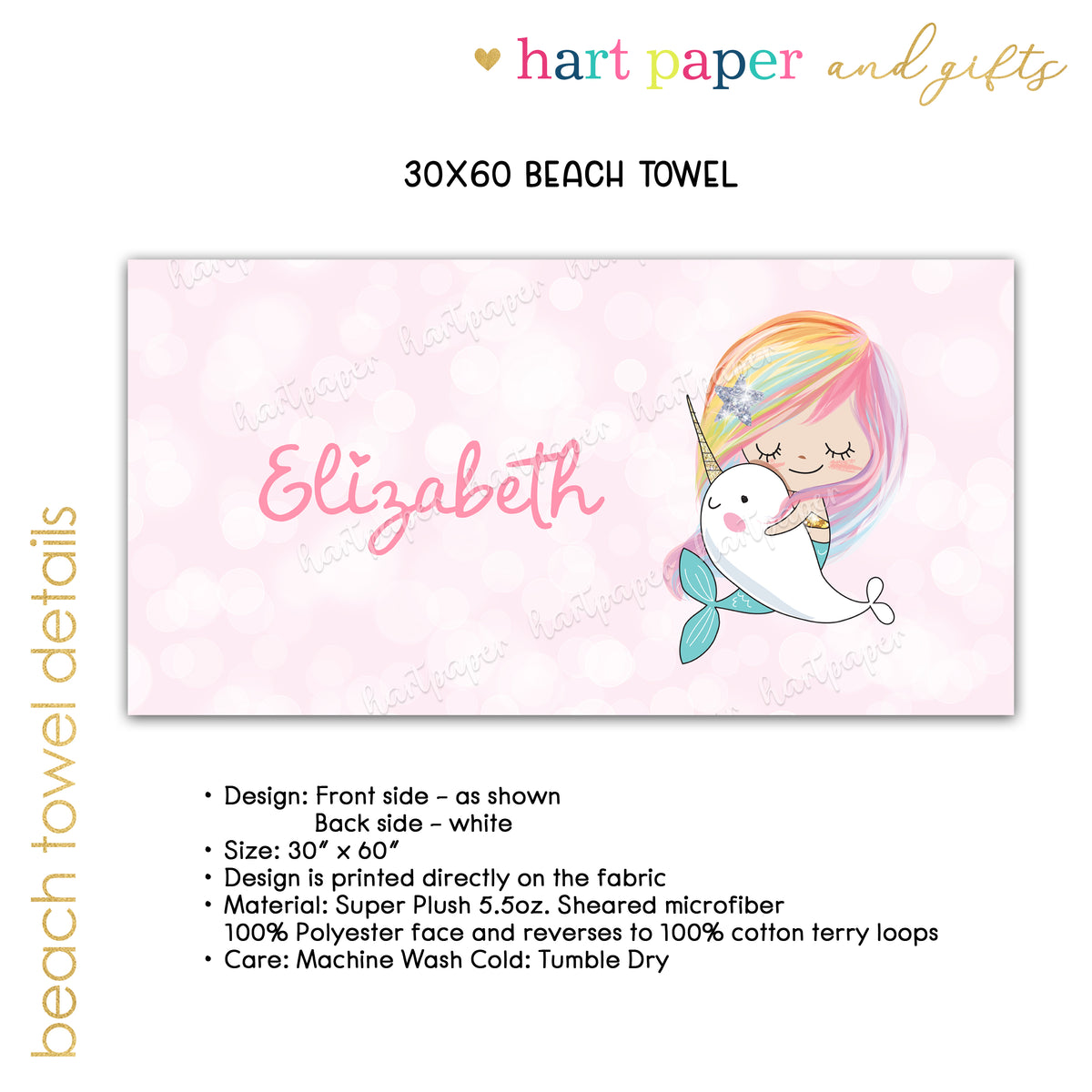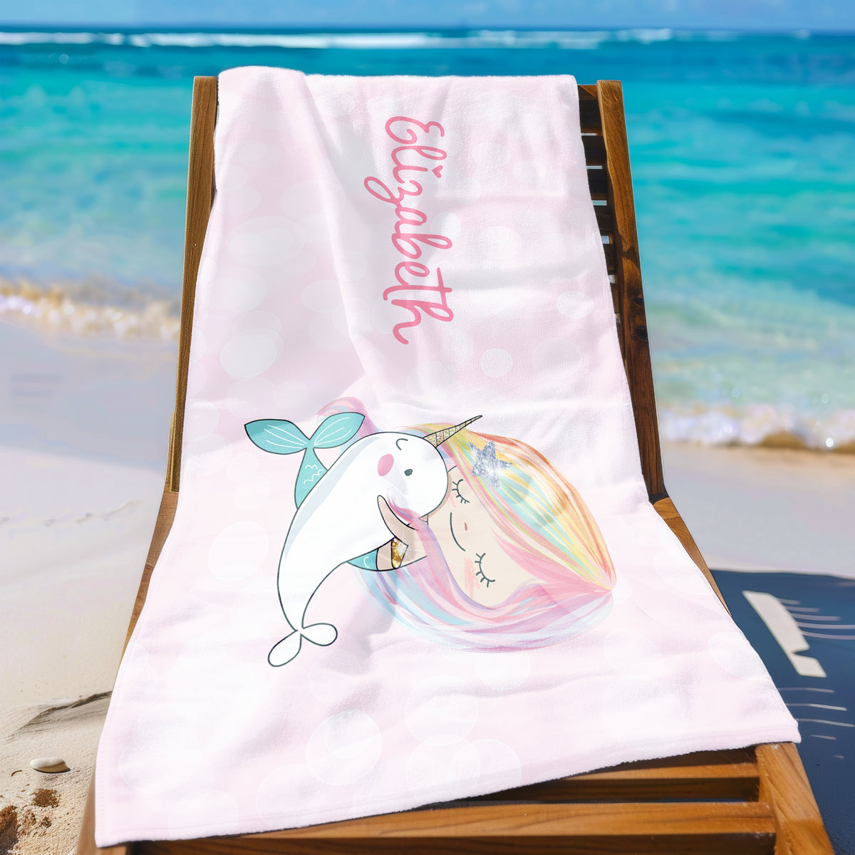 Rainbow Mermaid Narwhal Personalized Beach Towel • Custom 30x60 Swimming Swim Bath Bathroom Pool