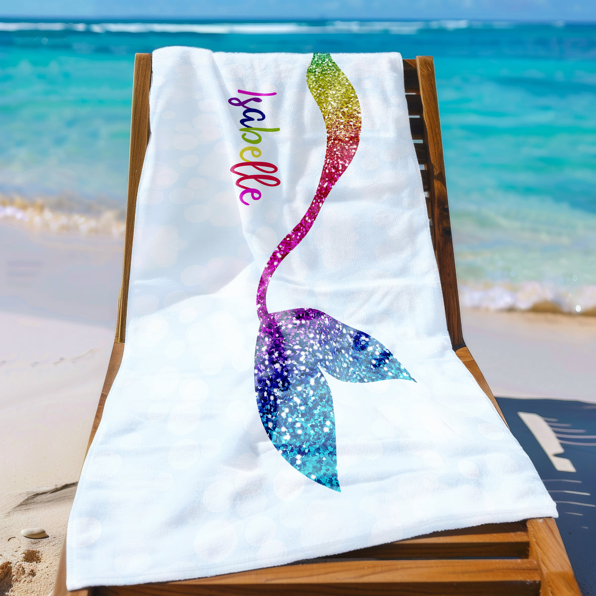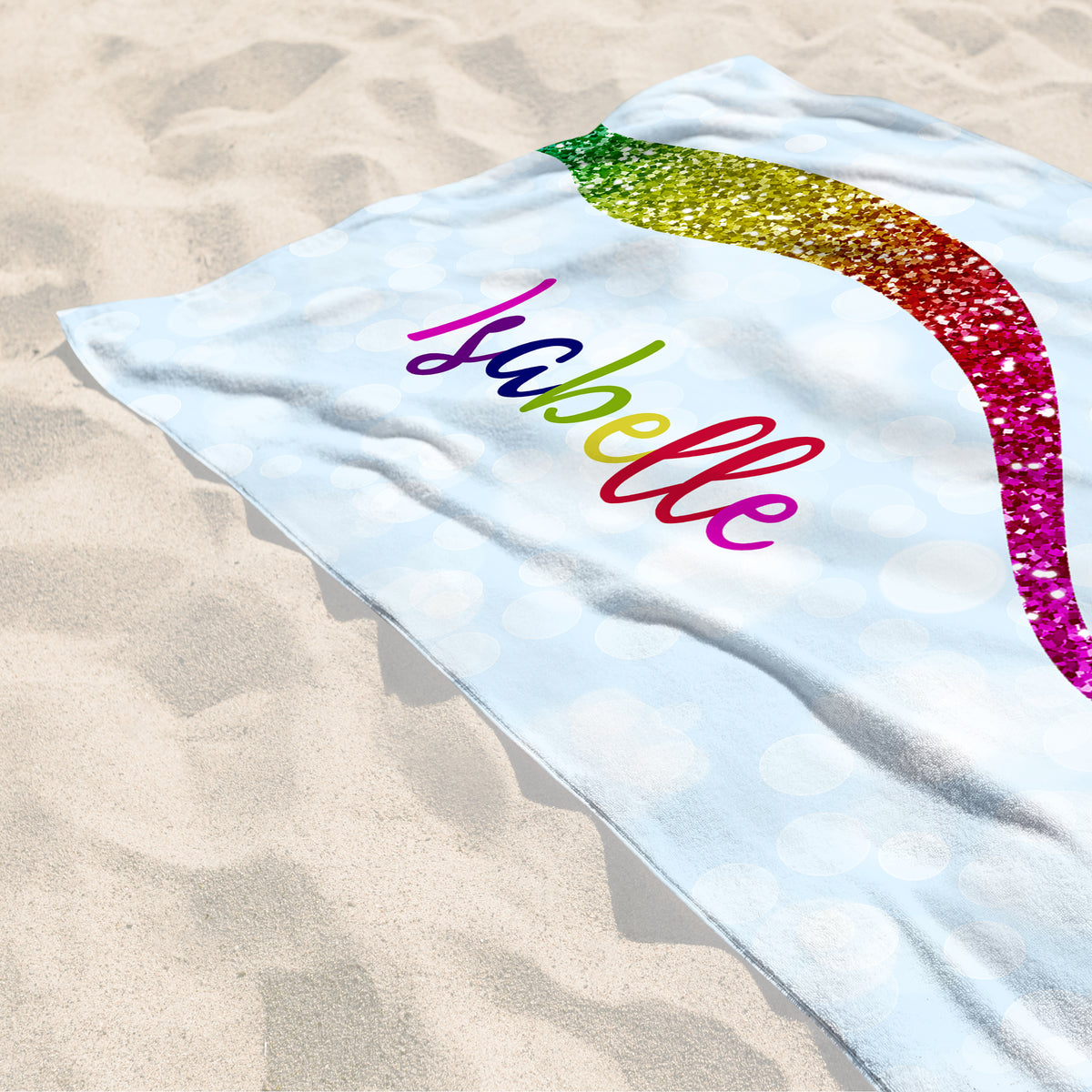 Rainbow Mermaid Tail Personalized Beach Towel • Custom 30x60 Swimming Swim Bath Bathroom Pool