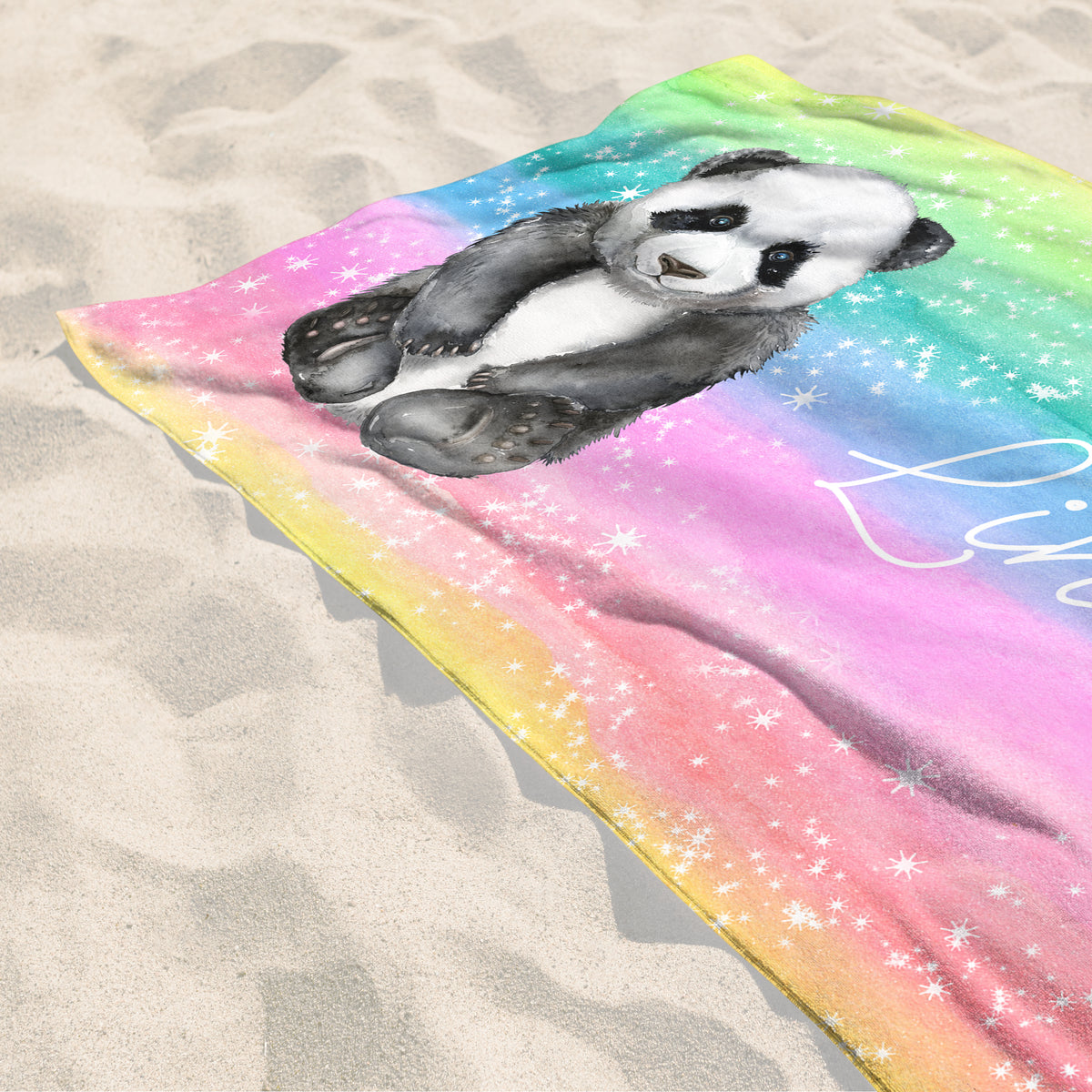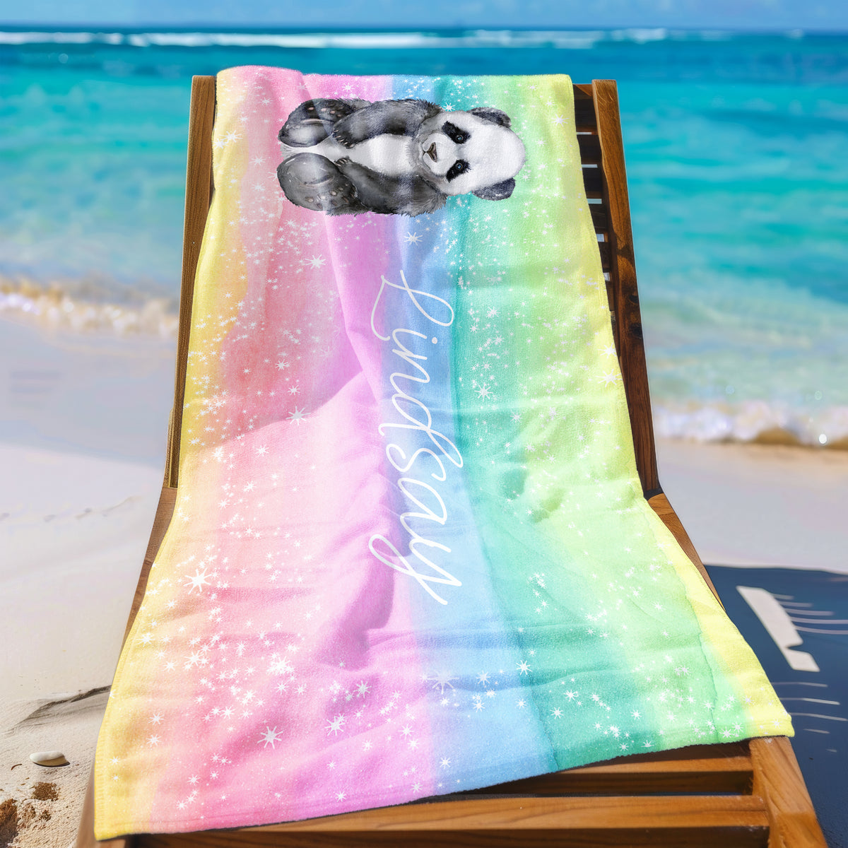 Rainbow Panda Bear Personalized Beach Towel • Custom 30x60 Swimming Swim Bath Bathroom Pool
